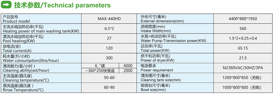 雙缸兩道漂洗單烘干平放式洗碗機MAX-440HD